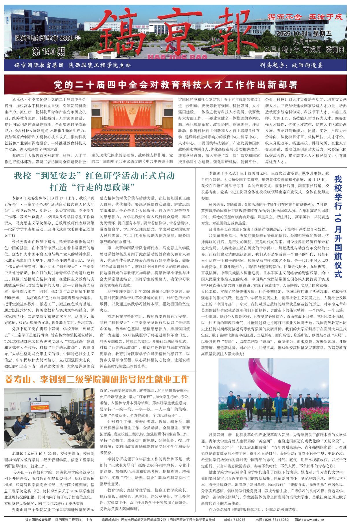 陕服新闻网讯(董良超)巍巍宝塔山,见证历史风云激荡;滚滚延河水,诉说岁月初心如磐。历史的浪潮奔涌向前,青年的选择掷地有声:“到延安去!”,追传承红色基因,感悟思想伟力。为深入学习贯彻习近平总书记关于坚持用延安精神教书育人的重要指示精神,扎实落实陕西省委、省政府关于立德树人工作的决策部署,充分发挥延安革命圣地红色资源的育人作用,让青年学子感悟延安精神,传承红色基因。11月15日至16日,陕西服装工程学院组织五百余名青年学子赴革命圣地延安,...