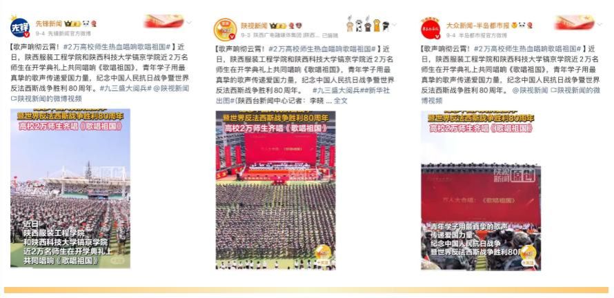 2025年秋季学期开学典礼上,吕明董事长带领陕服、镐京两校20000余名师生同唱《歌唱祖国》主旋律,纪念中国人民抗日战争胜利暨世界反法西斯战争胜利80周年。20000名师生同唱《歌唱祖国》这一令无数国人热血沸腾的壮举,彰显全国高校坚持把立德树人作为中心环节,把思想政治工作贯穿教育教学全过程,培养担当民族复兴大任的时代新人这一永恒主题,同时淋漓尽致地展现习近平新时代中国青年学子朝气蓬勃、昂扬向上的精神风貌。镐京集团20000名师生同唱《歌唱祖国》视频广受好评,陕西省教育厅、陕西省文化旅游厅和20多家主流媒体转载推广,迅速引发社会各界热烈反响,成为彰显镐京集团育人成效、传播校园文化的一张耀眼名片。