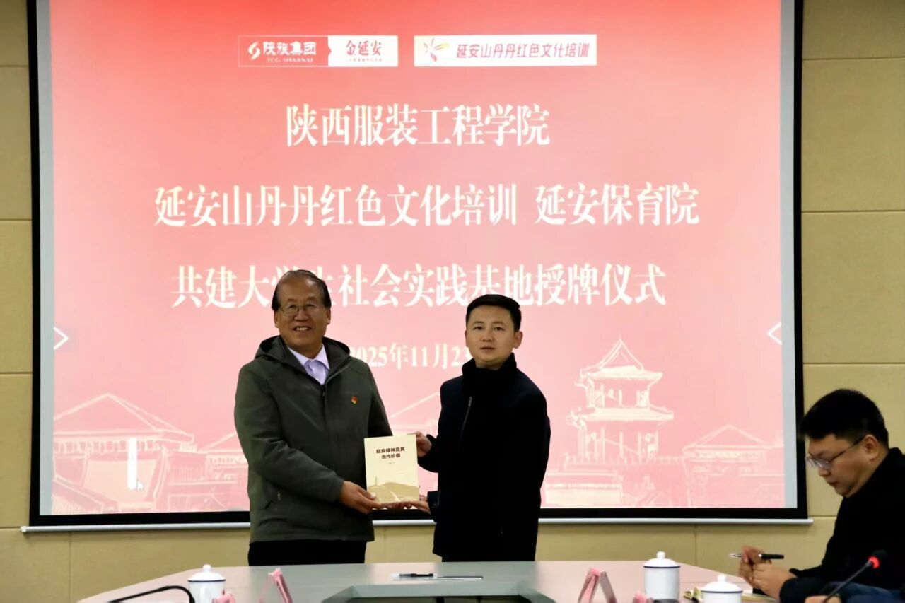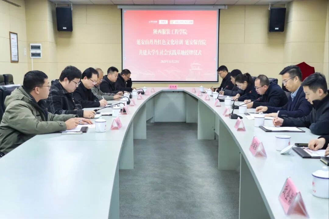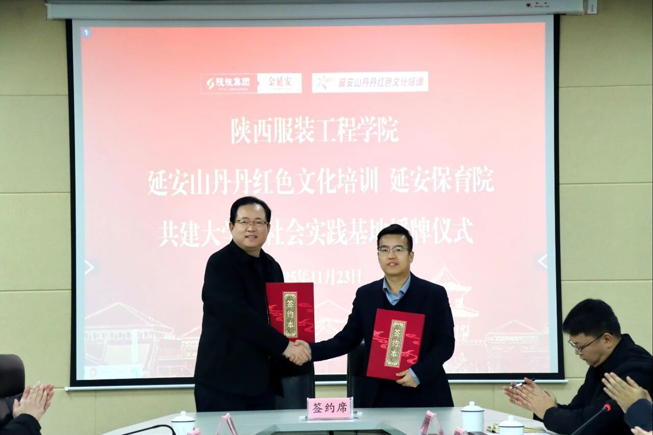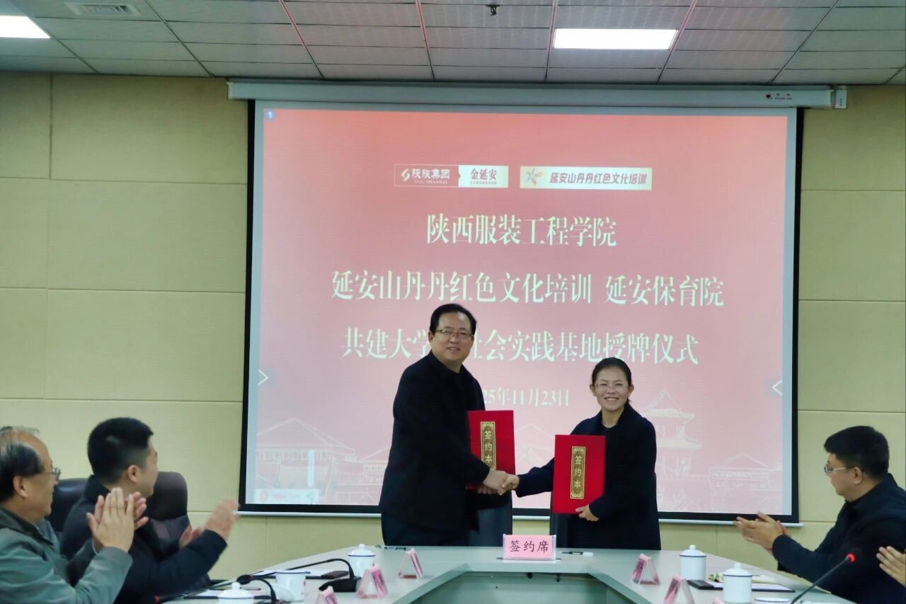 陕服新闻网讯(李文斌)11月23日,我校与延安山丹丹红色文化培训学院、延安唐乐宫《延安保育院》在延安举行大学生社会实践基地签约仪式。校党委副书记刘继兵,校长助理罗文谦,学工部副部长、校团委书记董良超,延安山丹丹红色文化培训学院院长白阳、副院长高艳、马小龙,延安唐乐宫《延安保育院》副总经理黑乐乐等出席仪式。