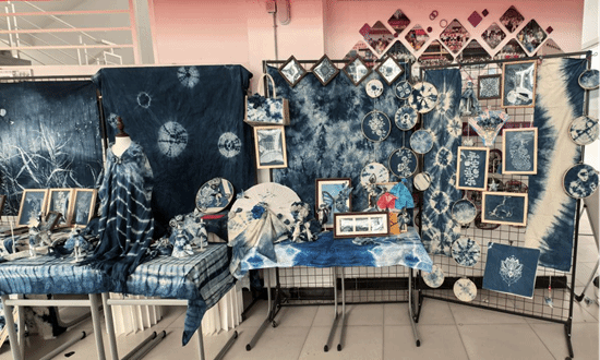 作为教育学院美术课程实践教学的重要成果展示,本次展览以“艺脉绵延润初心,美育同行向未来”为核心主题,鼓励学生结合色彩心理学、儿童发展心理学等专业知识,围绕儿童成长需求开展创作。扎染系列作品成为本次展览的吸睛焦点:展厅内以靛蓝为主色调的作品群,将传统扎染工艺与现代艺术表达相融合——从晕染出云雾纹理的布景织物,到点缀着蓝白花朵的装饰摆件,再到迷你扎染服饰模型,深浅交织的蓝白纹样既传递着非遗技艺的古朴质感,又以灵动的造型适配儿童审美。该系列创作者2023级学前教育专业学生团队介绍:“我们以‘青蓝’为核心风格,在扎染基础技法上加入立体装饰、场景化陈列的巧思,既展现传统工艺的美感,也希望让小朋友在触摸、观察中,直观感受到非遗的温度,实现审美熏陶与文化启蒙的结合”。