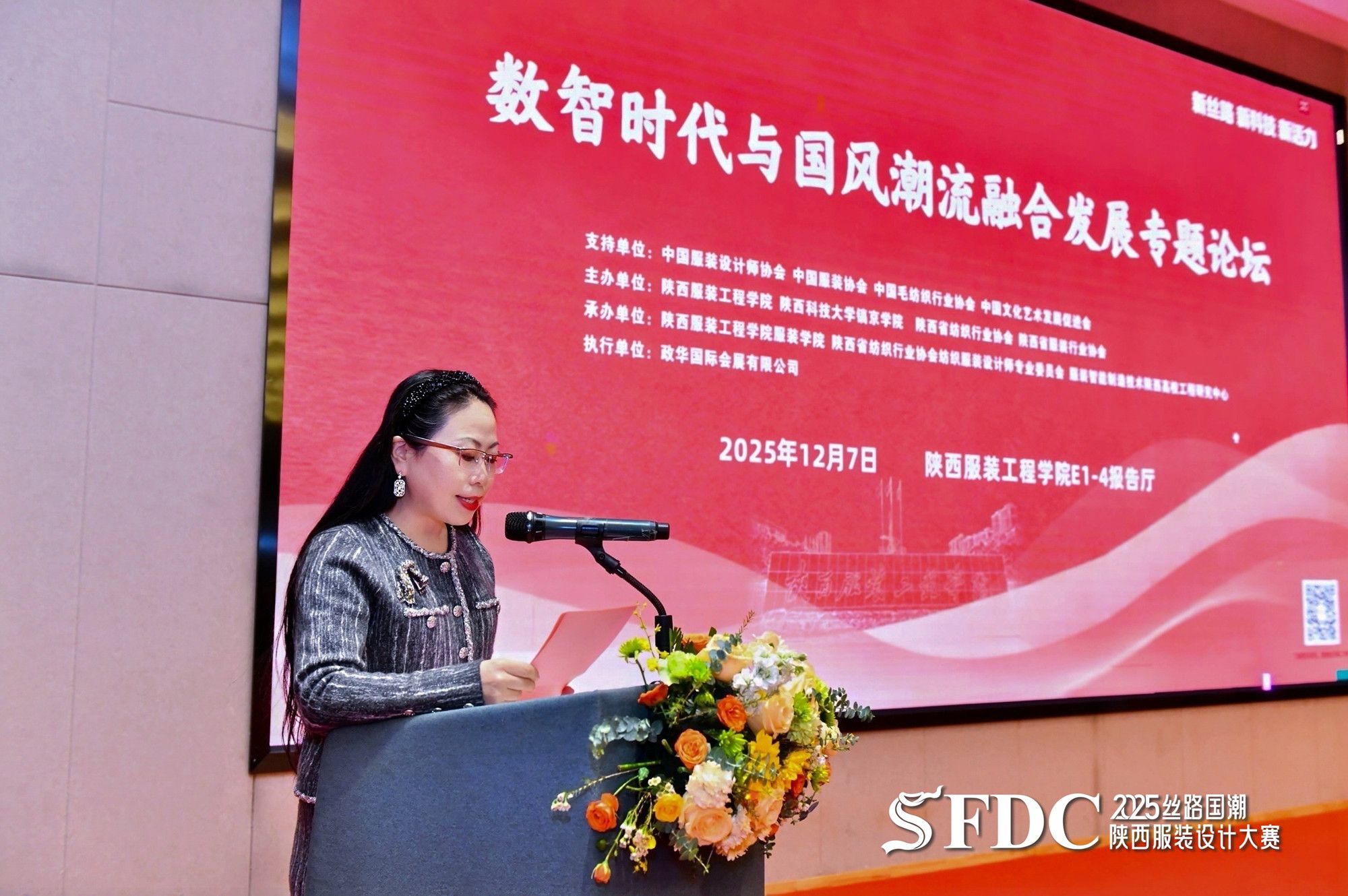 陕西省工业和信息化厅消费品工业处处长李洁讲话,她肯定了近年来陕西服装产业在传承传统文化、拥抱数字变革方面取得的成效,对服装学院金奖得者孙铭麒同学表示祝贺,并指出,数智时代为国风服饰发展提供了广阔空间,希望与会各方以此次论坛为契机,深化合作、协同创新,推动传统文化资源创造性转化、创新性发展,共同打造具有陕西特色、全国影响力的服装产业集群。