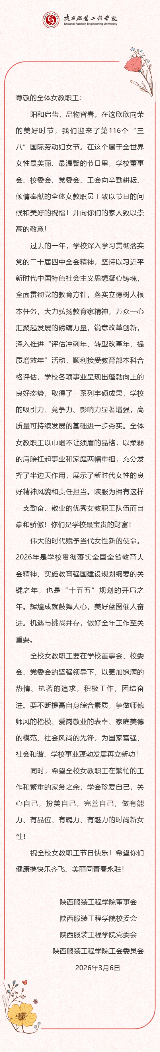 “三八”国际劳动妇女节学校致全体女教职工的慰问信