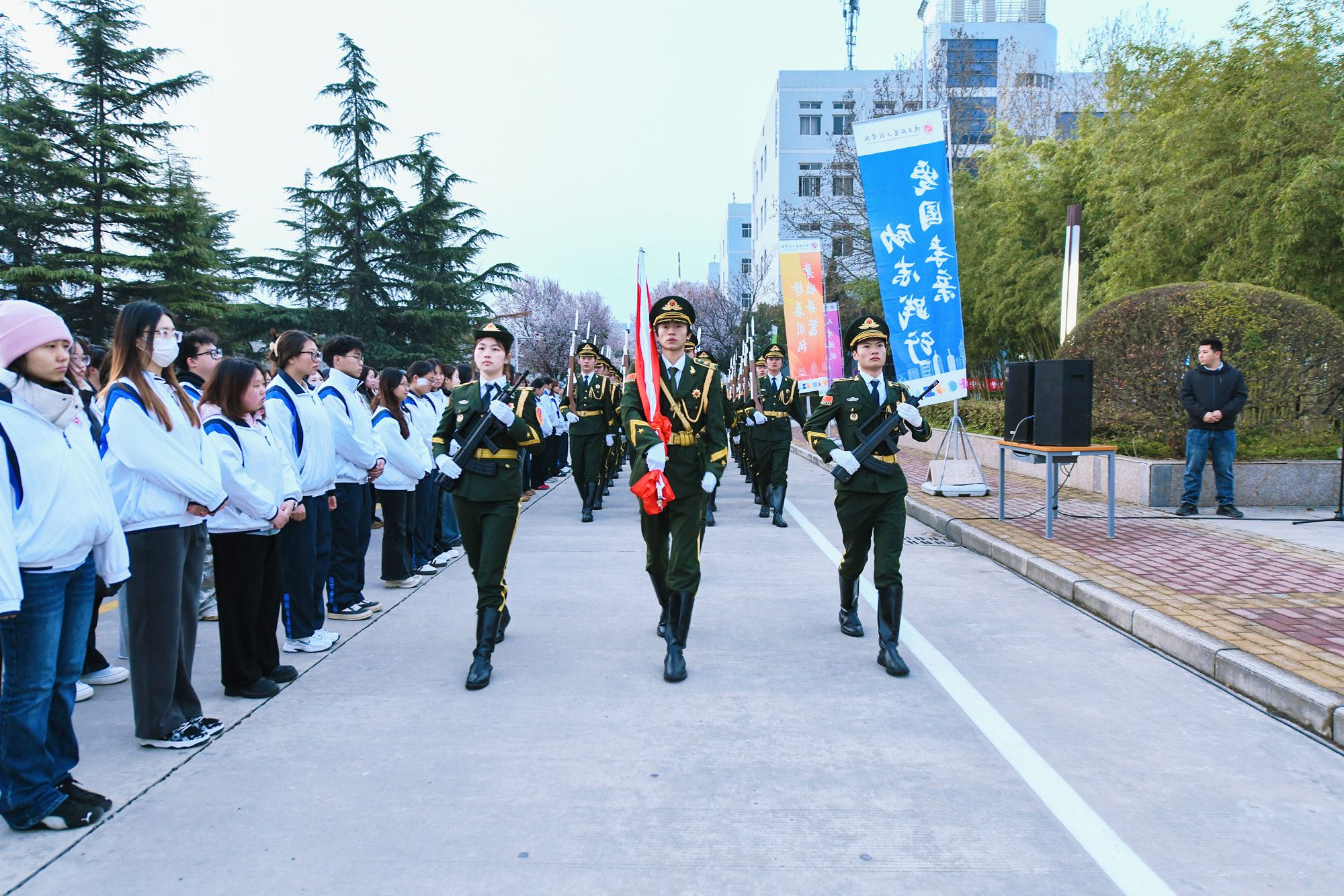 陕服新闻网讯(李文斌)3月16日清晨,我校在和谐广场举行3月份升国旗仪式。学校董事长吕明、校长姜寿山、党委书记王岗及在校校级领导、师生代表万余人齐聚广场,以国旗为誓,吹响新学期奋进的号角。
