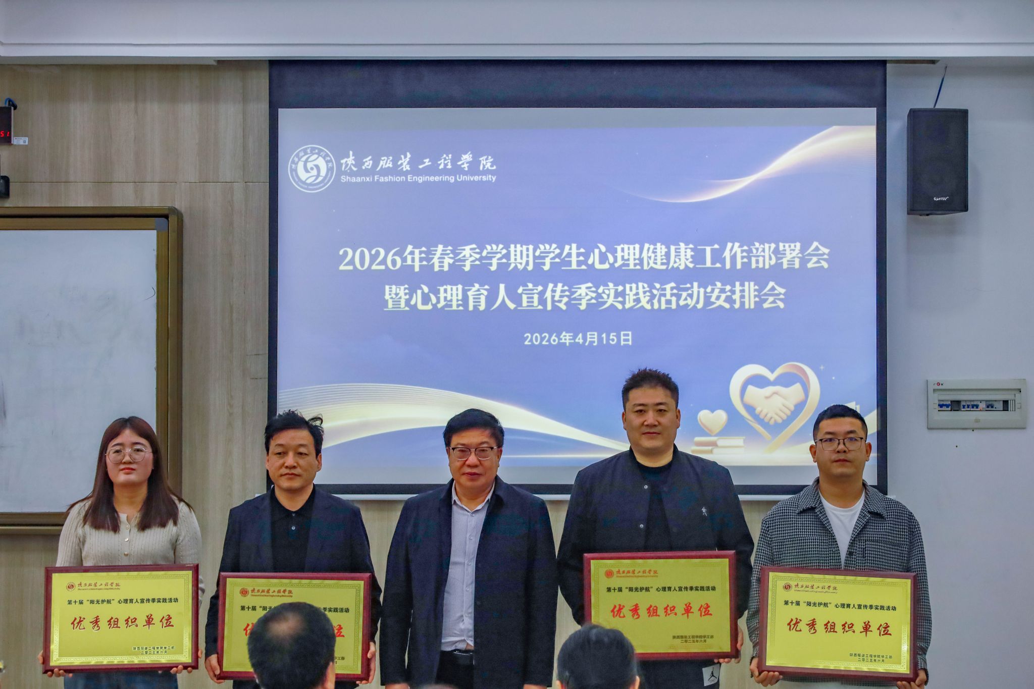 会议上,全体参会人员共同观看了2025年心理健康教育工作总结视频,回顾了过去一年我校在心理育人方面取得的阶段性成果。刘继兵通报了我校在省级心理健康教育相关评选中获得的荣誉,并宣读了陕西服装工程学院《关于我校第十届“阳光护航”心理育人宣传季实践活动成果表彰的决定》。在热烈的掌声中,王岗为获得第十届“阳光护航”心理育人宣传季实践活动优秀组织单位的服装学院、教育学院、健康学院、应用技术学院颁发了奖牌。