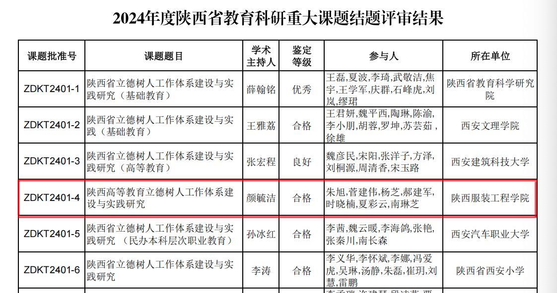 陕服新闻网讯(杨芝)近日,陕西省教育科学规划领导小组办公室发布《关于公布2024年度陕西省教育科研重大课题结题结果的通知》,由马克思主义学院院长颜毓洁、校长助理翟岁兵共同主持的《陕西高等教育立德树人工作体系建设与实践研究》(项目编号:ZDKT2401-4)顺利结题并进行公示。